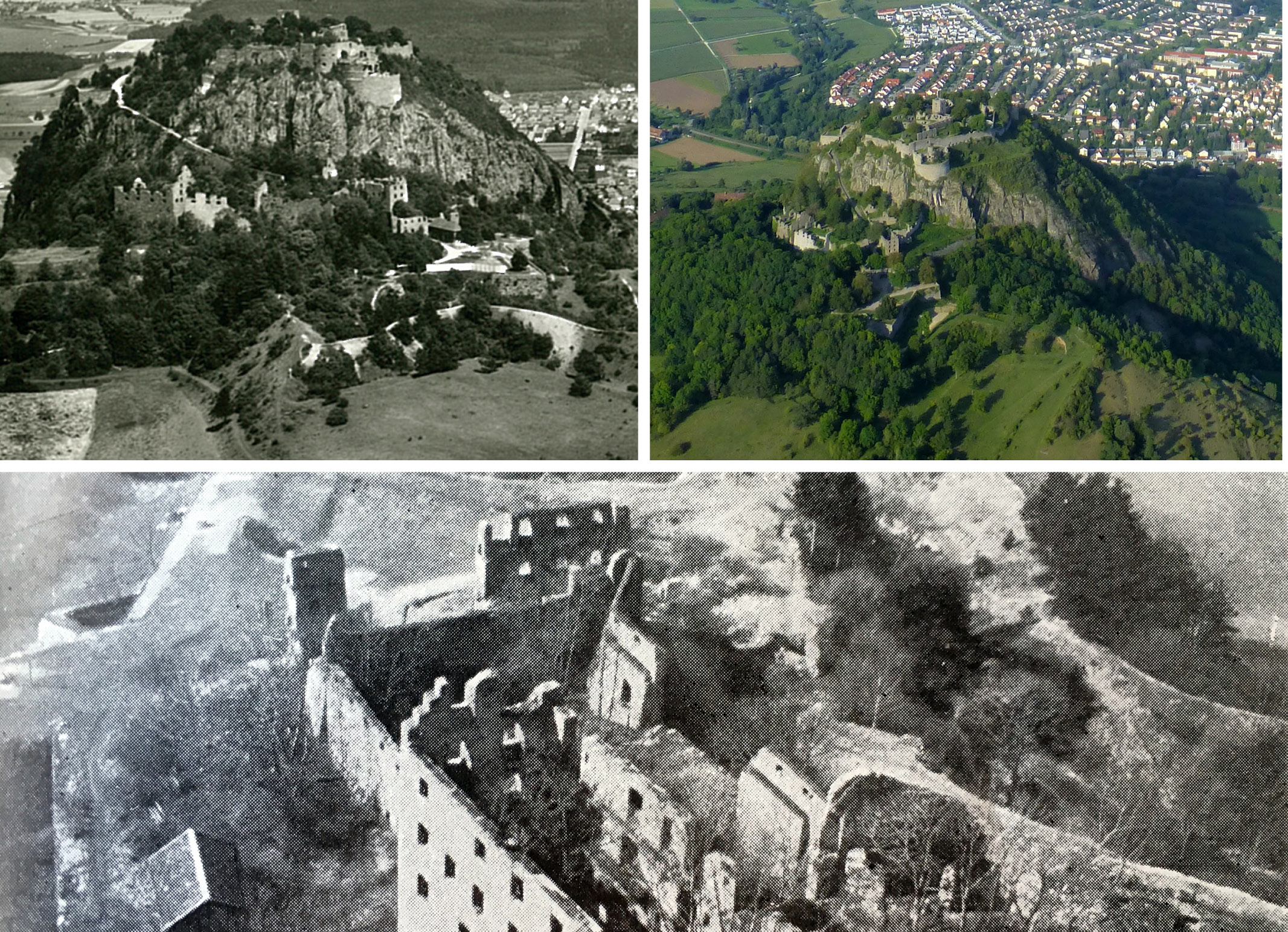 Das Foto zeigt den Hohentwiel vor ca. 60 Jahren: Während die Obere Festung und Teile der Karlsbastion damals dicht bewaldet waren, ist die Alexanderbastion noch baumfrei. Eine große Magerrasenfläche, heute mit Gestrüpp bewachsen. Die Alexanderbastion könnte, insbesondere im Interesse des Denkmal- und Naturschutzes, wieder freigelegt werden. Da sie im Landschaftsschutzgebiet liegt, wäre dies kein Problem.
